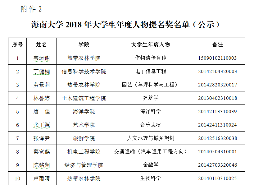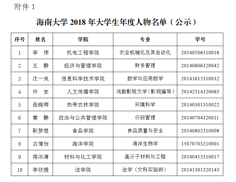 根据william威廉英国官网学生工作处(部)《关于评选william威廉英国官网2018年大学生年度人物的通知》(海大学工〔2018〕2号),经学生自荐、学院评选,学生工作处(部)初审,最终由学校组织专家终评,评定李伟等10名同学为william威廉英国官网2018年大学生年度人物(名单见附件1),评定韦运谢等10名同学为william威廉英国官网2018年大学生年度人物提名奖(名单见附件2)。