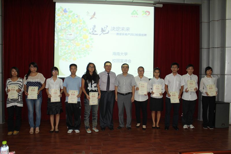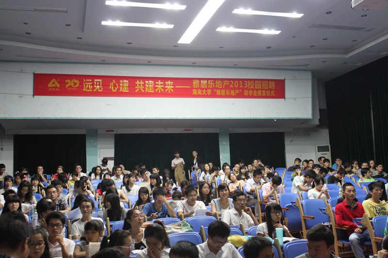 助学金颁发仪式结束后,进行了整个校园招聘的宣讲环节,现场气氛热烈,由雅居乐地产控股有限公司的王王清禄副总监对雅居乐公司概况、企业文化、企业发展历程进行了详细的介绍,并对整个招聘流程进行了介绍,主要包括加入公司后的发展空间、薪酬待遇、以及学子们所关注的问题,并热烈欢迎广大海大学子加入雅居乐这个大家庭。宣讲会最后是现场问答和简历递交环节,同学们踊跃提问,雅居乐负责人也对问题进行了解答,整个宣讲会在热烈友好的气氛中结束。