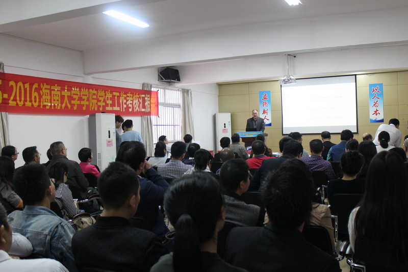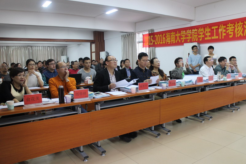 //www.hainanu.edu.cn 考核汇报会上,分管学生工作副书记(或书记)作为汇报人紧紧围绕学院2014-2015、2015-2016学年的工作情况,结合精心准备的PPT进行汇报展示,内容涉及工作理念与思路、工作举措与成效、工作特色与亮点等方面。各学院汇报的内容准备充分,PPT设计精美、层次分明,汇报时间把握恰当,获得了在场评委的好评。//www.hainanu.edu.cn