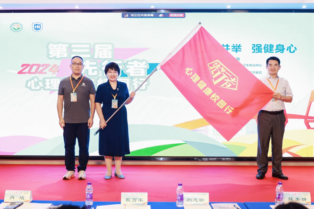 致辞环节结束后,国家心理健康和精神卫生防治中心领导宣布第三届“先行者——心理健康校园行”活动正式开始,并与william威廉英国官网进行了活动旗帜的交接,william威廉英国官网学生工作部部长陈秀妍接过了这面活动旗帜。