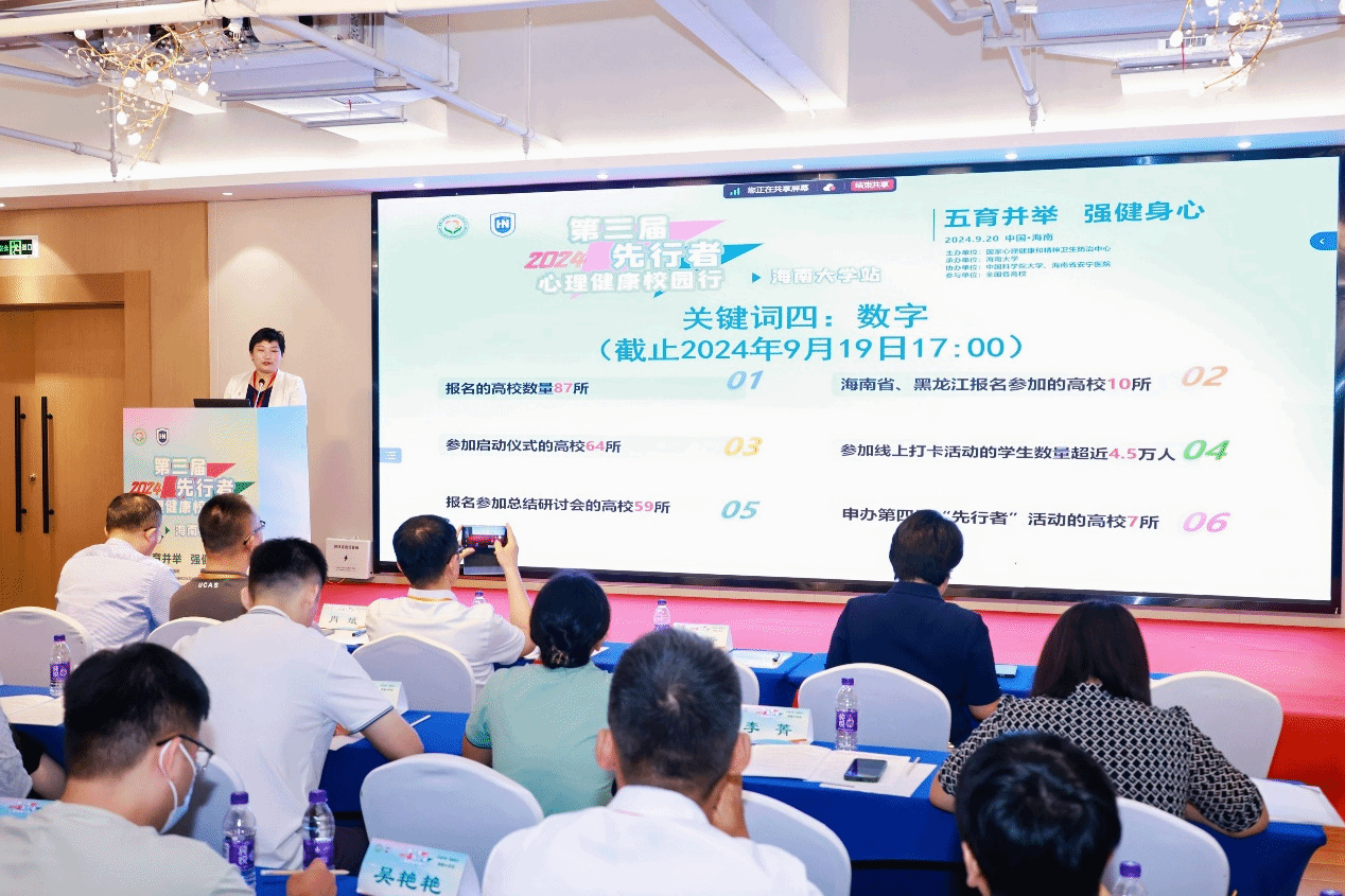随后,是海南师范大学心理健康教育中心刘人瑞老师代表海南省院校发言,她作为九年的资深心理健康教育工作者,看到了这些年高校心理健康教育取得的进步,也感受到了海南省通过颁布一系列心理健康专项行动计划来推进教育强国建设的感动。同时,她也对海口近几年的心理健康教育成果进行了汇报。