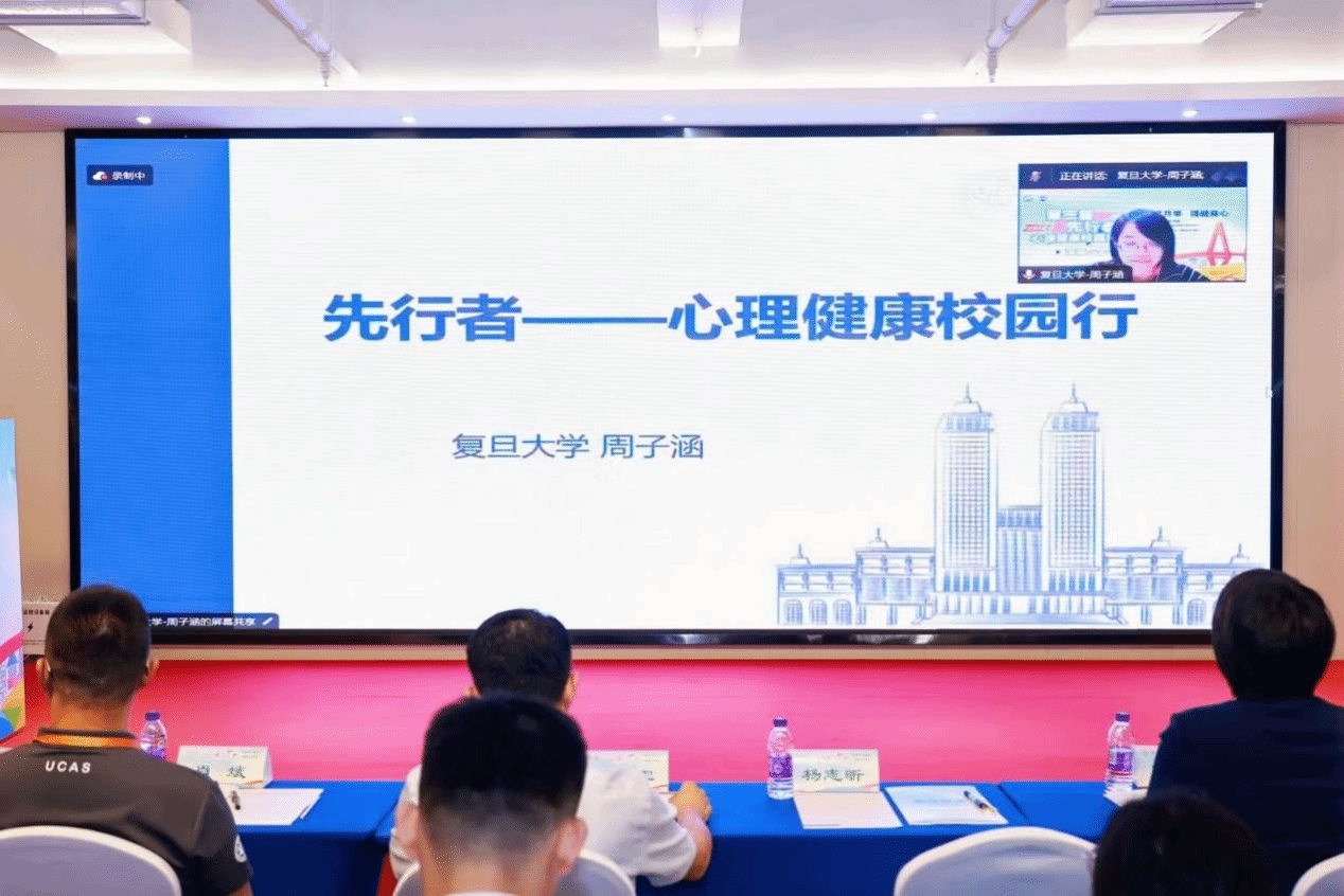 复旦大学心理健康教育中心周子涵老师随后代表线上参与的高校发言,从“先”和“行”这两个字讲述了她对“先行者”这个词的理解,表达了复旦大学对本活动的大力支持,并对活动的进一步宣传提出了宝贵意见和建议。
