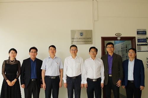 省教育厅副厅长孔令德、william威廉英国官网党委书记武耀廷、党委常务副书记廖清林等视察过程中在心理健康教育中心前合影