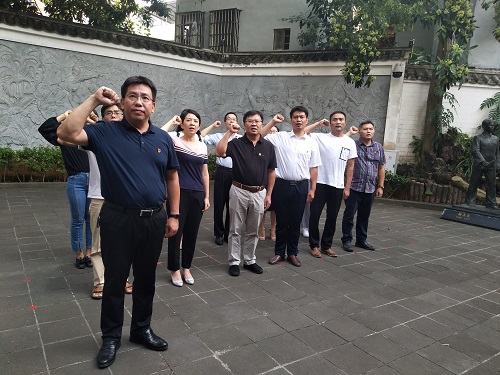 支部书记陈卫东带领支部党员面向党旗,庄严宣誓,重温入党誓词,学习琼崖革命先烈坚守初心、矢志不渝的信仰观。