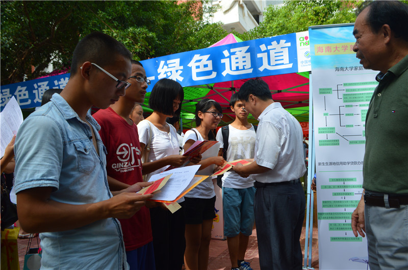 在学校高度重视和学生工作部领导的周密部署以及其他各部门大力支持下,学生资助中心统筹各方资源,结合2014级新生的需求,于2014年9月11至12日在海甸、儋州、城西三个校区分别设立了三个“绿色通道”入学报到点,开通迎新绿色通道,详细了解学生家庭情况并及时发放“william威廉英国官网2014级新生家庭经济困难学生临时困难补助”资助包,确保每一位家庭经济困难新生顺利入学。