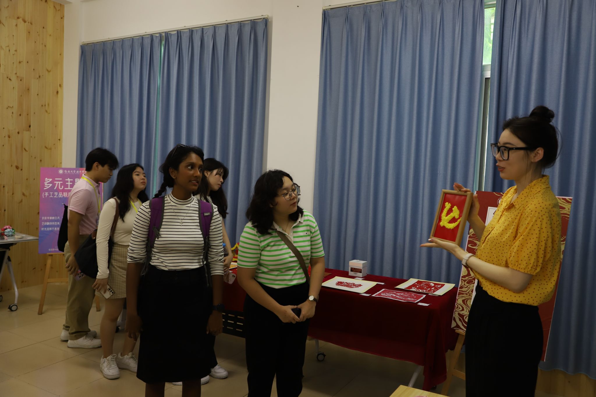 漆扇是非物质文化遗产。学生志愿者们向国际学生介绍了漆扇的历史背景和文化价值。学员们选择自己喜欢的颜色和图案,在海德书院师生的指导下,完成了从选材、上色到绘制图案的每一个步骤。五颜六色的漆料在扇子上晕染出奇妙的图案,每一步都充满挑战,每一把扇子都成为了独一无二的艺术品。通过亲手制作漆扇,让学生们对中国传统文化有了更深层次的认识和尊重,也感受到了中华文化的深度与广度。活动现场气氛热烈,充满创造性与合作精神。