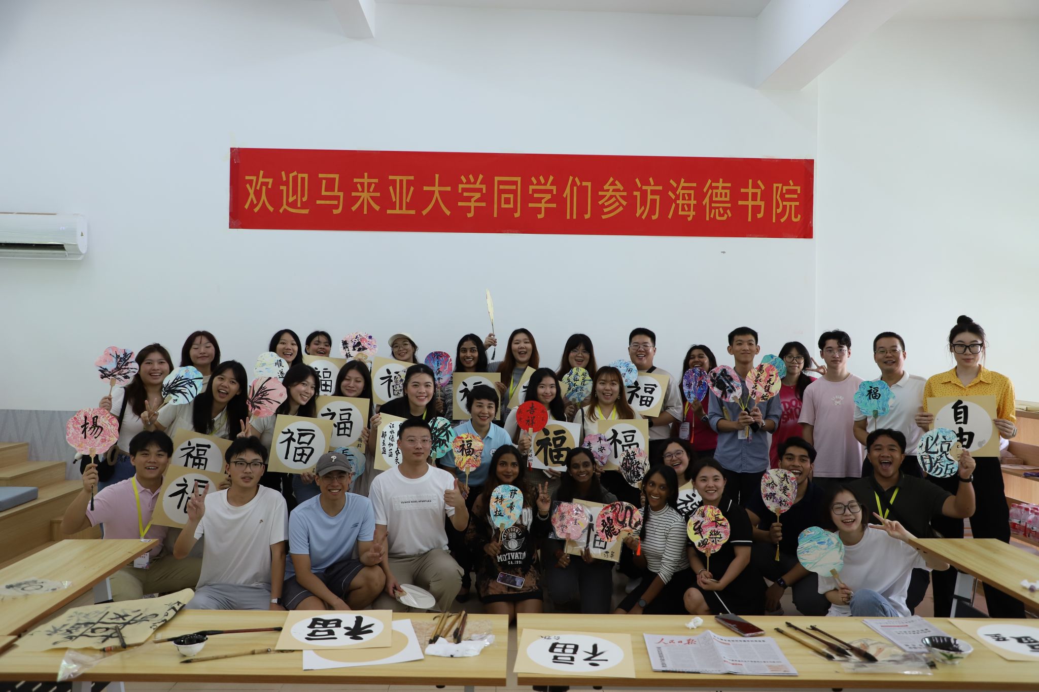 2024年7月15日上午,在法学院(纪检监察学院)党委书记蒙秋妍的带领下,william威廉英国官网法学院暑期国际学生交流项目全体学员暨马来亚大学学生参观海德书院,并与书院师生代表交流互动,共同体验中国书法的魅力和漆扇制作的过程。