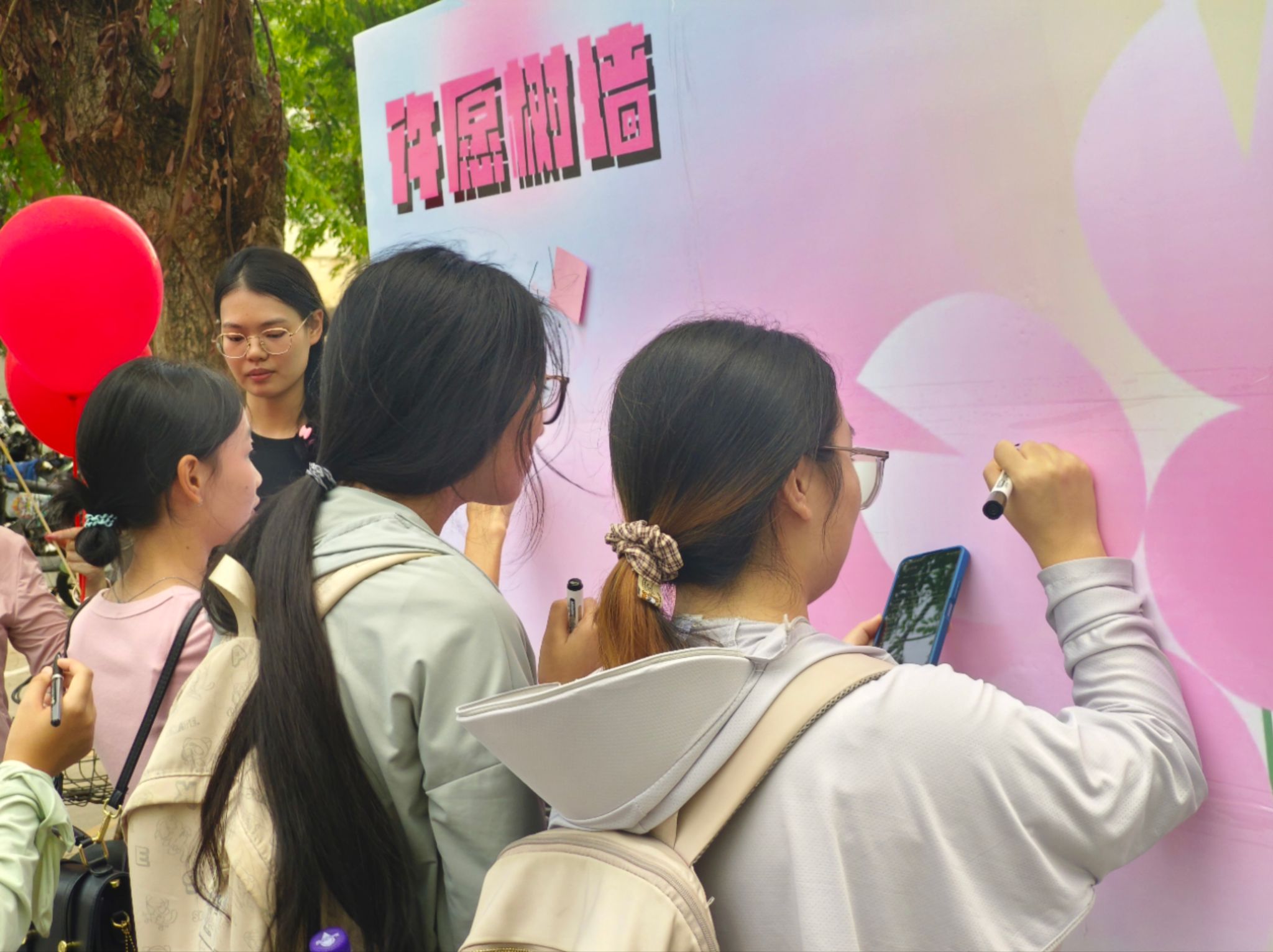 许愿树墙前,师生们写上对祖国的美好祝福