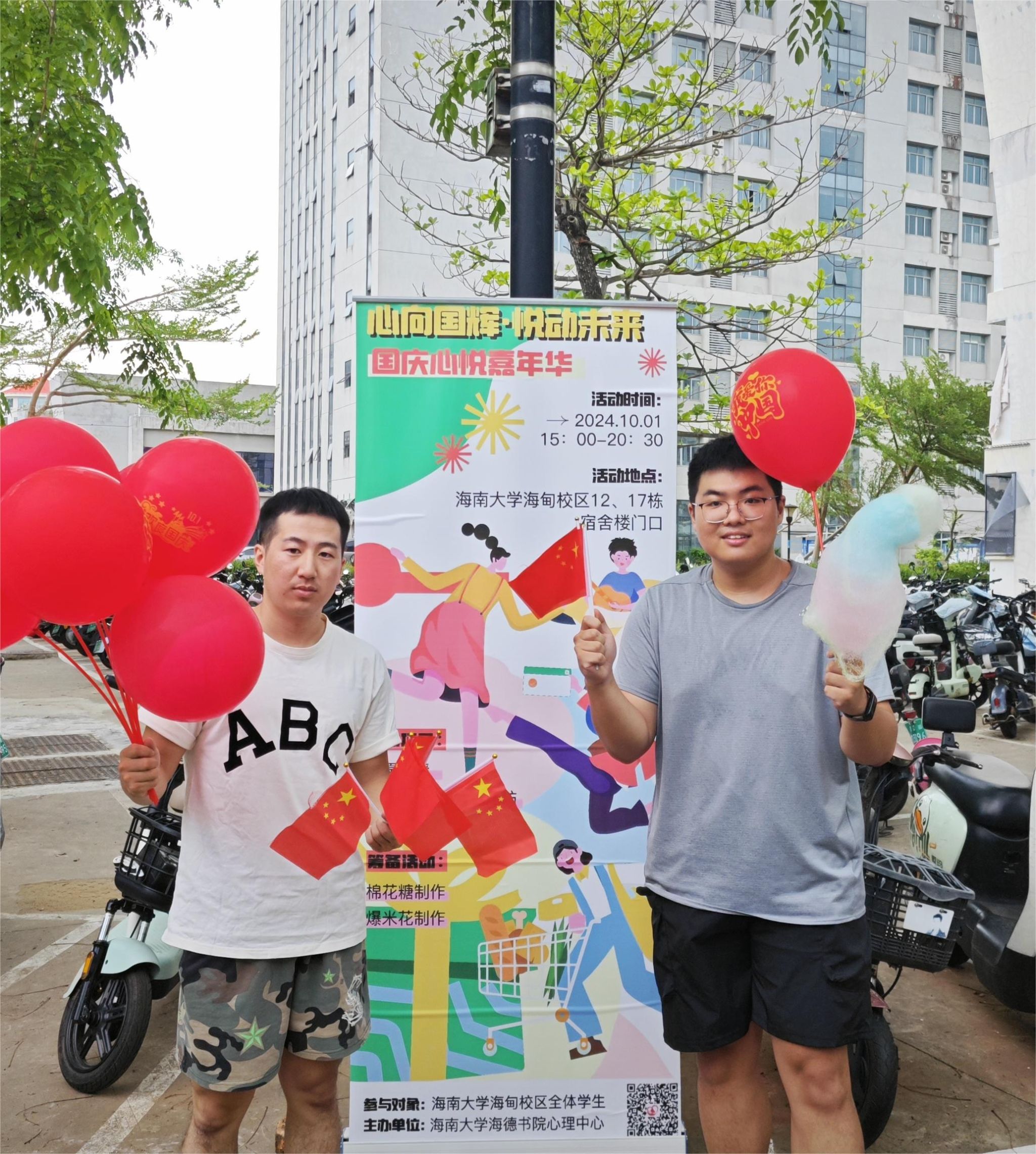 为庆祝中华人民共和国成立七十五周年,2024年10月1日,海德书院心理中心在学生公寓17栋楼前广场举办“国庆盛典,心向阳光”国庆主题活动。此次活动得到了书院全体师生的热烈响应与积极参与,现场气氛热烈。