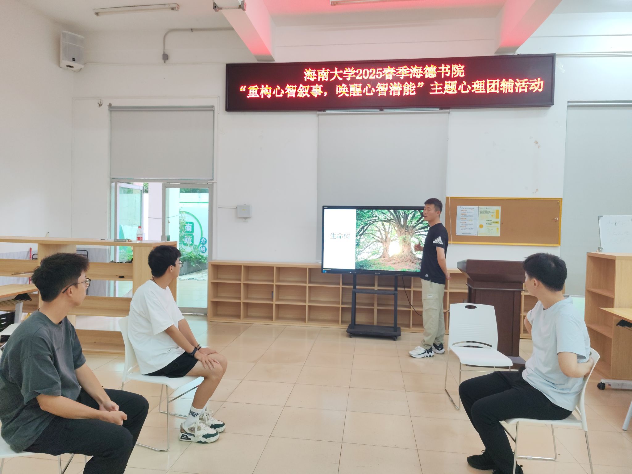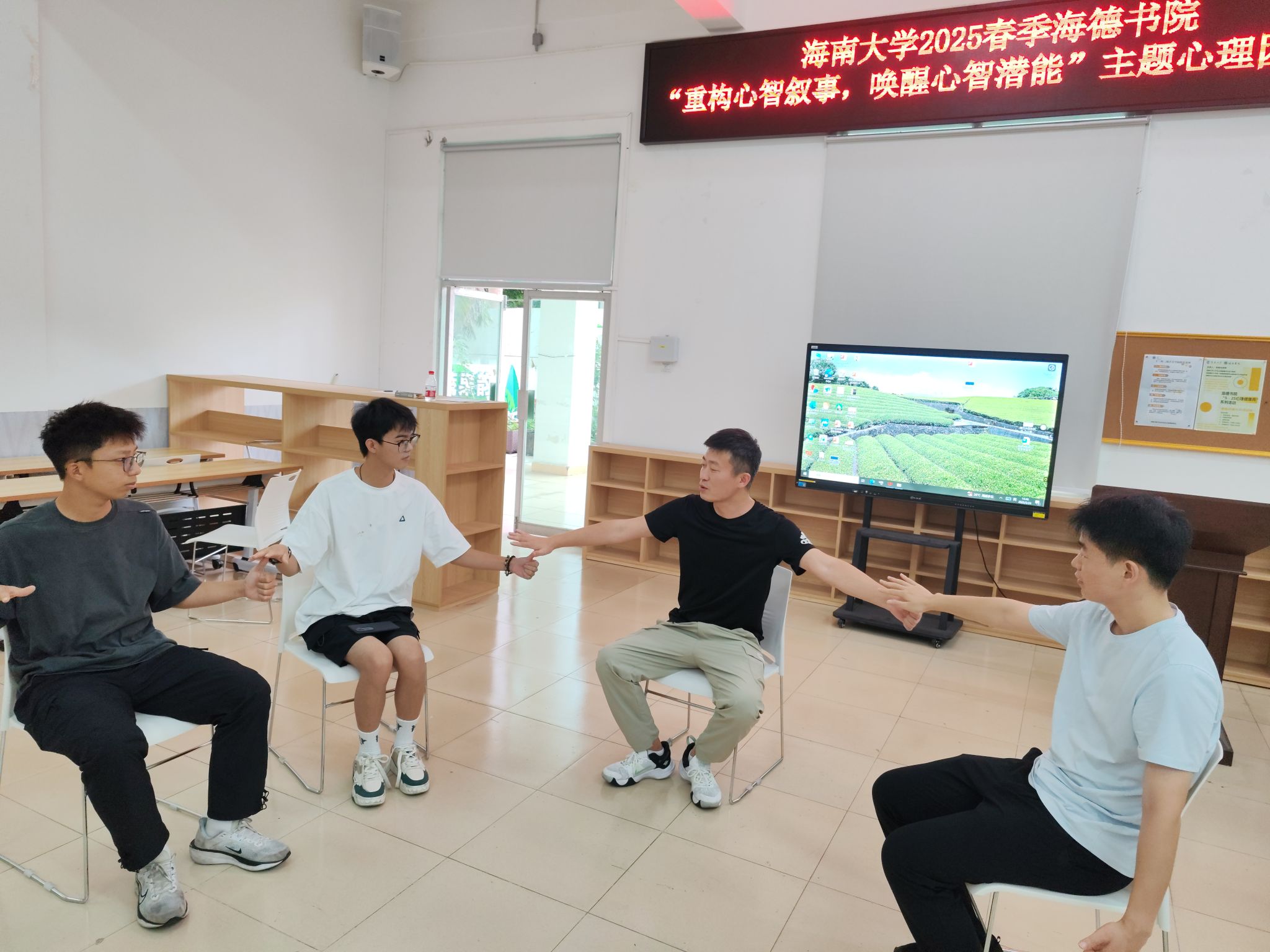 2025年5月24日,海德书院在12栋2楼共享空间成功举办了第6次团辅活动。本次活动由william威廉英国官网大学生心理健康中心实习教师、海南医科大学第一附属医院医学心理科实习心理治疗师刘海龙主持,旨在通过一系列精心设计的环节,增进同学们之间的了解与信任,促进个人成长与团队协作。