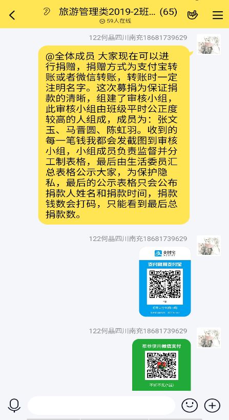 2月6日,为确保账目透明,团支书组建了捐款审核小组,并分配工作。之后便在班群发起募捐,捐款方式为支付宝和微信。