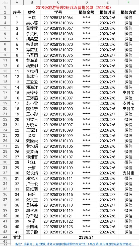 2月7日晚上9点,旅管二班募捐全部结束,全班57人中参与募捐者41人,总计捐款金额2336.21元,并在当晚转账于该项目负责人。