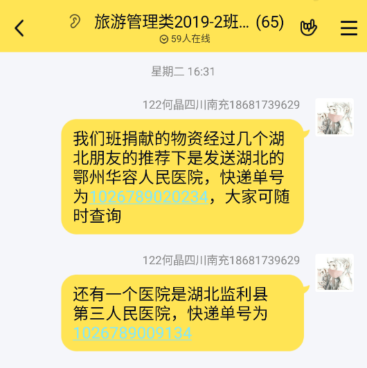 截至目前,物资已送达医院,班级募捐负责人仍在关注物资情况。荧光虽弱,仍照大千,2019级旅游管理类2班的同学们参与募捐,一句句祝福,一笔笔善款,一件件物资,都见证了他们在抗击疫情中表现出的团结与温暖。