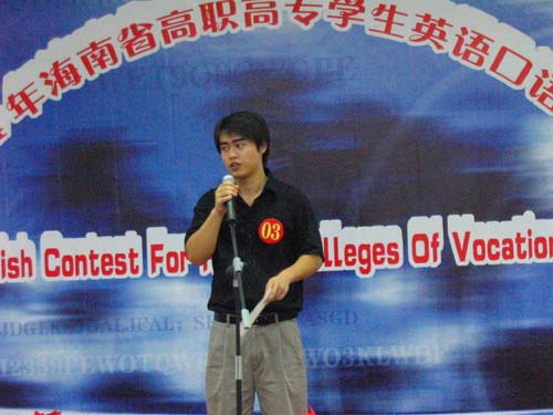 为深化高职高专教育英语课程教学改革,展现和提高高职高专学生英语口语表达能力,激发高职高专学生学习英语的积极性,海南省高职高专学生英语口语大赛于2004年9月25日在海南经济技术学院隆重举行。在来自全省十多所大学、高职高专院校的30多名优秀选手中,我校选手表现突出,取得了优异的成绩:来自02宾管的汪冠宇同学获得第一名,02计算机应用专业刘凯同学获第二名。