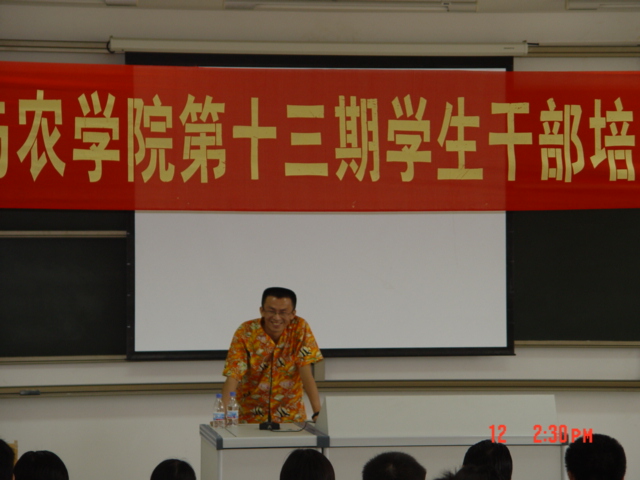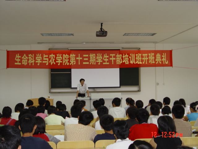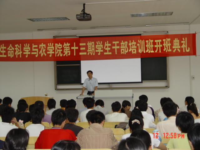 2004年10月23日上午8时,生命科学与农学院在3号教学楼110阶梯教室举行第十三期学生干部培训班开班典礼,校宣传部副部长黄丽芹、校团委书记符成彦、学院党总支副书记王强、院团总支书记何欢宝、学工办李丹等领导和老师参加了开班典礼。我院校友郑文权、王鹏也应邀参加了开班典礼。参加培训的人员有学生党员、团总支学生会干部、各团支部班委会干部,共计174人。开班典礼由院学生会主席林程同学主持。