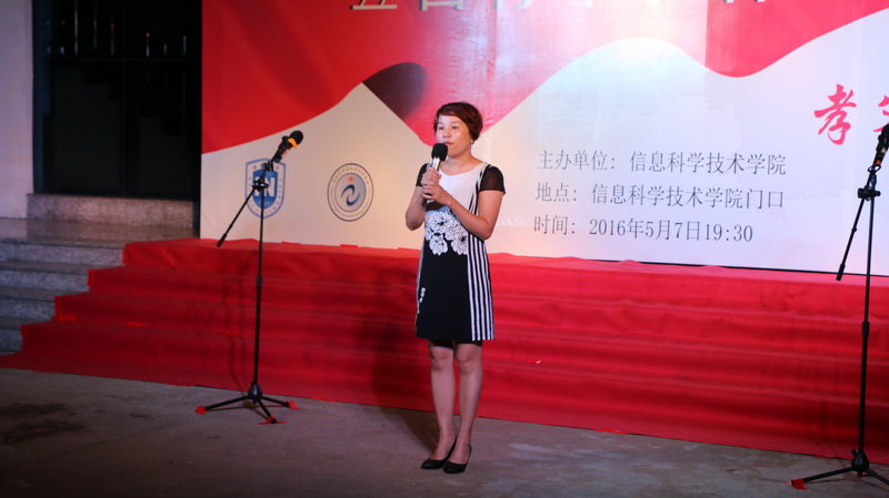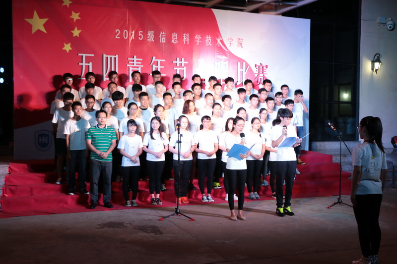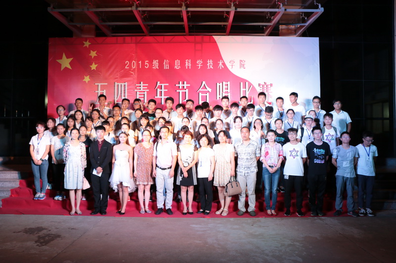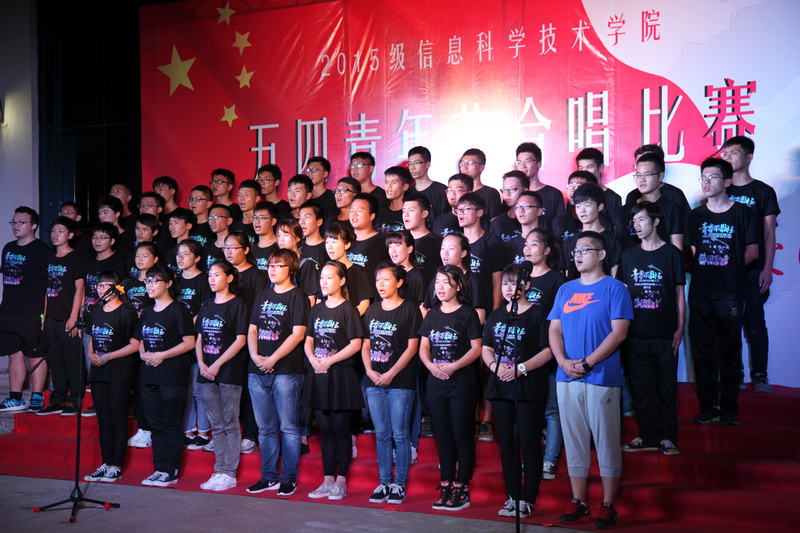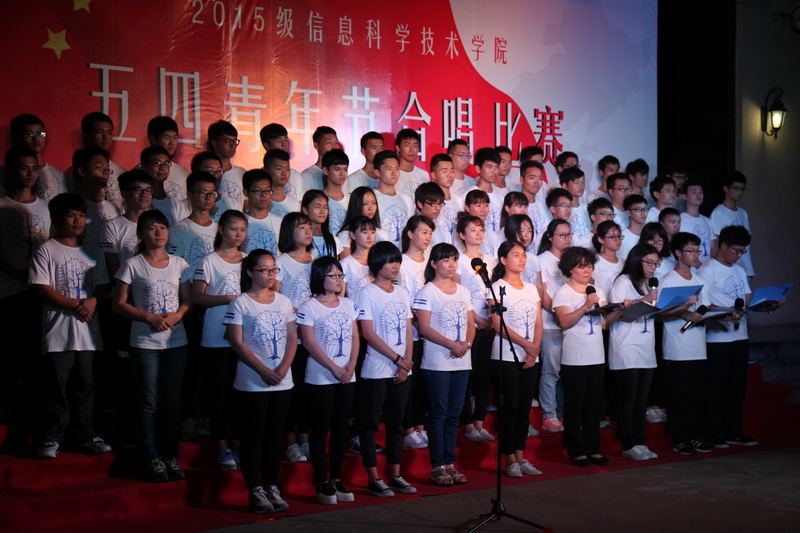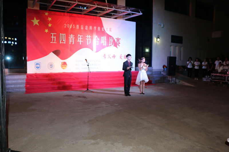 为大力弘扬五四精神和时代主旋律,抒发与祖国共奋进、与时代齐发展的青春感受,在实现中华民族伟大复兴的中国梦的生动实践中放飞青春梦想,进一步展现信息学院团员青春风采,2016年5月7日晚七点半,经过一个多月紧张排练和筹备的“孝父母 爱国家”信息科学技术学院五四青年节合唱比赛在信息楼前举办。担任本次比赛的评委分别是农学院团委书记周霞老师、信息科学技术学院陈鹏老师、贾宝莹老师、艺术学院豆浩同学。信息学院党委副书记蒙秋妍老师,团委韩胜丁老师,学工办欧少红、齐昌盛、许达潭、齐有伟老师,信息学院张琼宁、靳婷老师及2015级班主任李海燕、陈羡美、陈丹、任佳、郭锦、岳晓蕊等老师观看了比赛。