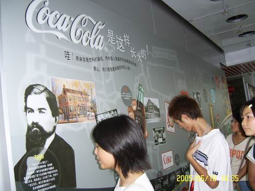 在讲解员的带领下,同学们观看了生产流水线,明白了可乐的生产过程,并看到在先进的生产设备下,每名工人可在每分钟内生产200多瓶瓶装可乐,生产效率可谓很高。在“可乐长廊”里,大家加深了对可口可乐百年历史的了解,对每种可乐新产品的问世历程有了更深层次的了解。最后在“可乐吧”里,同学们免费品尝了可口可乐的系列产品。