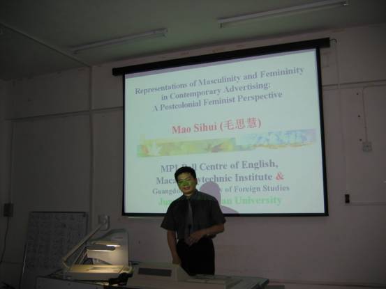 2005年6月2日晚和6月3日下午,外国语学院邀请我校兼职教授,原广外大英文学院院长、中国中美比较文化研究会副会长、广东外国文学学会秘书长、中国翻译协会理事、澳门理工学院(MPI)剑桥贝尔英语中心教授兼中心副主任、广东外语外贸大学兼职教授及英语语言与文化专业博士研究生导师毛思慧教授给外国语学院广大师生做了两场精彩的讲座。这两场讲座同时也为外国语学院剑桥英语教师培训项目第二期划上了圆满的句号。第一场讲座的内容是《当代平面广告中男女形象再现的后殖民女性主义透视》。该讲座以美国文化批评家Bell Hooks的“White Supremacist Capitalist Patriarchy” 理论中关“Motivated Representation” 的论述和部分女性主义理论为基点,探讨了环球化语境中当代广告男女形象的表层/深层含义,分析权力和 “话语”对“再现”的种种制约,以及通过 “解构”来寻找 “另类叙述”的可能性和必要性。在第二场讲座《跨文化情景里的‘冲突管理’》中,毛教授运用部分语用学及文化研究的理论,试探性地提出“Humanetic” 这一包含“人文-互联”内容的课堂教学理念。讲座利用电影小品、图片、广告等大众文本,展示不同文化背景的人们不同的价值观念和交际行为,以及在“Humanetic” 课堂上如何引导学生洞悉跨文化交际的深刻内涵,并有技巧地避免/化解 “文化冲突”。他认为,英语教学的最大挑战不是语言本身而是语言背后的文化,在经济和文化 “环本化”(Glocalization)日盛的今天,传统的课堂教学模式已被 “消解”。在讲授过程中,气氛活跃,形成了一种和谐的互动。讲座的与众不同主要表现在理论与实践相结合,对我院英语教师如何上好英语课和英美文化课,学习者如何学好英语具有极大的帮助和指导意义。