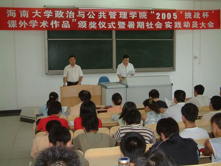 为了进一步推动我院教学实践与科研活动的深入开展,不断提高学生的创新精神与实践能力,2005年6月21日下午,政管学院在3-210召开全院师生大会,隆重举行“政治与公共管理学院2005年‘挑战杯’课外学术科技作品颁奖仪式暨暑期社会实践动员大会”。大会由副院长胡斌武博士主持。 在颁奖仪式上,首先由副院长李德芳教授宣读《william威廉英国官网政治与公共管理学院关于表彰2005年“挑战杯”课外学术科技作品竞赛优秀论文和优秀指导教师的通知》。接着,张治库院长给获论文优秀指导教师奖的李芬、李德芳、王章佩、沈德理四位教师颁发了证书及奖金;党总支王默忠书记给获奖的优秀论文作者代表颁发了奖金。 颁奖仪式结束后,张治库院长对即将到来的暑期社会实践活动作了动员,他要求全院师生要重视学生创新精神和实践能力的培养,通过社会实践来加强教师对学生科研能力的指导,调动学生社会实践的热情和积极性,推动我院实践性教学工作的持续开展,以逐步形成我院的办学特色。 最后,由获得本次“优秀指导教师”奖的李芬老师给全院学生作了“社会实践调查与调查报告写作方法”的讲座。