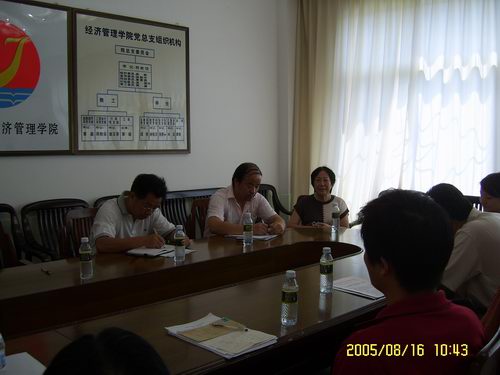 2005年8月16日上午,校评建办公室在康耀红、符华儿、严庆三位副校长的带领下莅临我院指导评估工作,教务处副处长李婷、评建办金玉澄顾问、林华、邓井红等一行一同来学院指导评估工作,经管学院充分重视此次教学评估检查工作,黄景贵院长、符史岱书记、学院李仁君、李寿文、黄淑芬副院长、各系主任等都参与了此次学校对我院的教学评估检查工作。