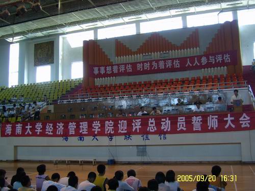 大会在庄严的国歌声中拉开了序幕。首先副校长林强教授发表了重要讲话,他代表学校向我院全体学生强调了迎评的重要性,阐述了我校目前的总体情况,希望全体学生加强迎评意识,在迎评过程中树立主人翁意识,关系学校的评估,情系学校发展。其次,院长黄景贵博士作了迎评总动员报告,黄院长的报告主要分三部分,第一部分为什么要迎接教育部本科教学水平评估;第二部分学院为迎接评估做了哪些工作;第三部分下一步应该怎样做。黄院长用生动幽默的语言讲述了迎评促建的重要性,号召全体学生以良好的精神面貌迎接教育部本科评估的到来。紧接着国贸系系主任王宏副教授和学生韩旭分别代表教师和学生发言,王宏老师表示全体老师在迎评促建过程中要更加严格要求自己,努力使教学科研工作更上一个台阶,用心工作,为人师表,鞠躬尽瘁,死而后以。学生代表韩旭表达了全体学生的心声,要秉承“勤奋、多思、求实、进取 ”的海大精神,积极进取、明礼诚信、勤俭自强、刻苦钻研、开拓进取。以主人翁的姿态,饱满的热情、扎实的专业基础知识向评估专家展示海大经管学子的风采。时刻铭记作为一名海大经管学子的使命,我们有信心也有决心打好这场评估攻坚战。