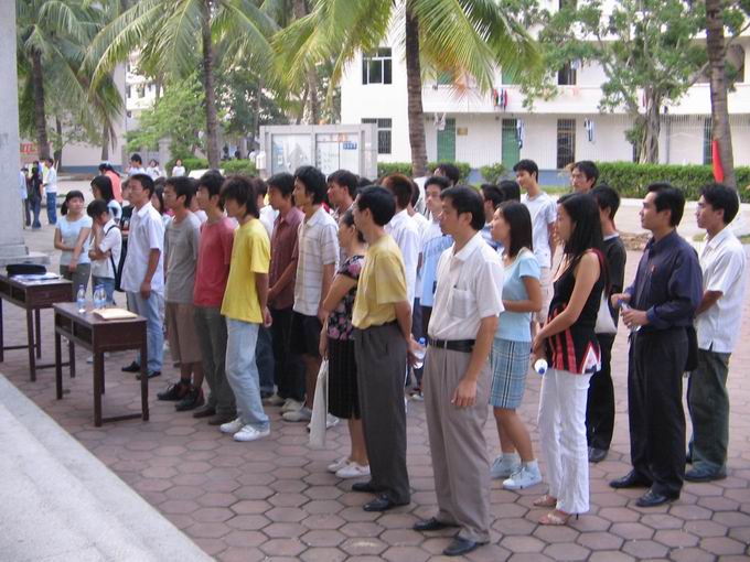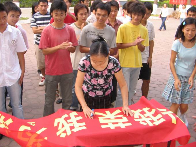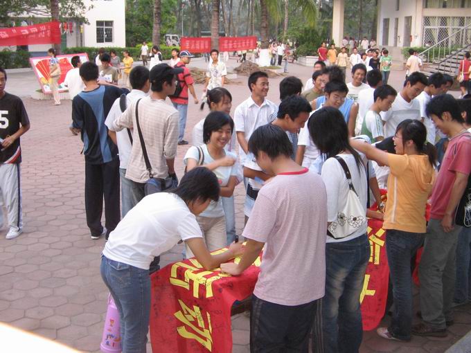 2005年10月24日下午5时,生命科学与农学院04级园林班团支部在学生宿舍区组织以“爱我海大、校兴我荣、我为海大添光彩”为主题的签名活动。参加活动的领导有校督导小组漆绮慧、校科研处处长吴兴亮、院党总支副书记王强、园林系主任林尤河、04园林班主任罗丽华、学工办李丹老师以及学院团委学生会部分学生干部。活动由04园林班学习委员刘帅同学主持。