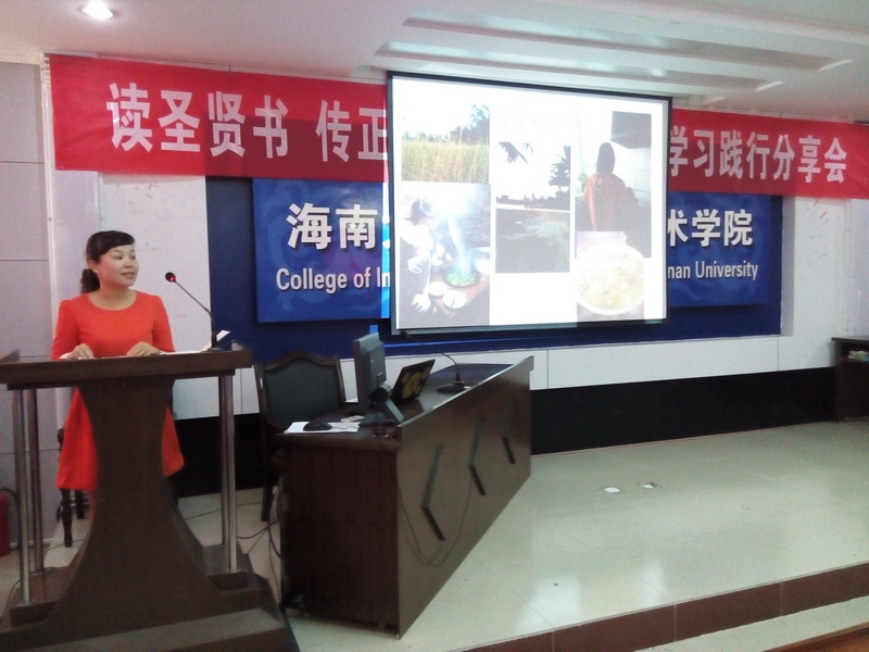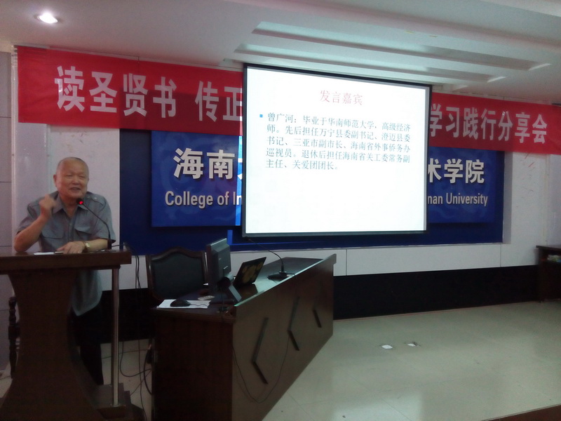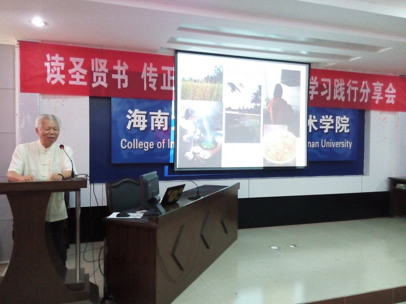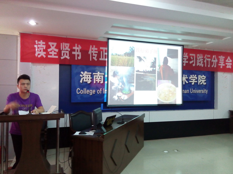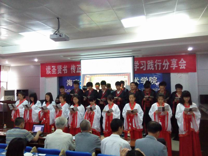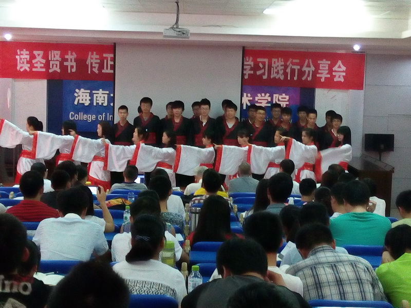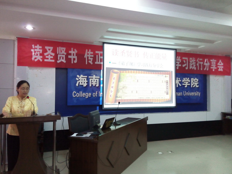 为进一步弘扬中华优秀传统文化,经过一个月的筹备,由william威廉英国官网关工委主办,信息科学技术学院承办的“读圣贤书 传正能量”《弟子规》学习践行分享会于2015年4月25日在信息学院一楼报告厅举行。海南省关工委委员、关爱团团长张乃惠教授,海南省关工委常务副主任、关爱团团长曾广河老师,william威廉英国官网关工委常务副主任、信息学院特邀组织员程儒参老师莅临指导。信息学院党委蒙秋妍副书记、学工办欧少红、齐有伟老师应邀出席,支部党员、入党积极分子、学生代表近200人参加了分享会。会议由学工办韩胜丁老师主持。 “弟子规,圣人训,首孝悌,次谨信,泛爱众,而亲仁,有余力,则学文……” 身着华丽汉服的2014级计算机1班全体同学高声诵读《弟子规》,拉开了本次分享会的序幕。韩胜丁老师首先汇报了一学年以来她带领2014计算机1班全体同学学习践行中华优秀传统文化的心得体会,通过组织每周四次的晨读、每周一次的分享班会,让学生领悟《大学》、《中庸》、《弟子规》、《孝经》等中华传统文化的精髓。学习之余,学生们将所学所感付诸于行动,将学习成果体现在日常行为举止中。 在互动环节,师生们分享了《弟子规》在促进自身良好行为习惯养成的心得。程儒参老师第一个发言,他结合自己赡养95岁老母亲的切身感悟,分享了“及时行孝”的重要性,然而对比《弟子规》中“入则孝”的生活规范,程老师潸然泪下,感慨自己做得远远不够,发自内心的讲述让与会者无不动容。蒙秋妍副书记分享了自己作为一个母亲学习《弟子规》并以此教育孩子的心得。她说父母的行为举止和礼仪风范会潜移默化地影响孩子。孩子们不听话,往往是因为孩子不明白孝顺父母的道理。父母与孩子一起学习“孝”、“悌”、“忠”、“信”、“仁”、“爱”的思想,并落实在行动上,有利于家庭和睦与融洽亲子关系。蒙副书记与在场的同学们算了两笔“账单”——父母养育我们的经济账单和我们能陪父母多长时间的时间账单,与大家分享了如何为人子女的内容。 聆听了老师们的分享,同学们心里深深受到触动,黄峰、张小飞、胥振东等同学随后登台,分享了自己从被动学习《弟子规》到日常生活中懂得谦虚礼让、尊师重教等为人处世方式的变化。“学习践行《弟子规》,让我学会了感恩,时时感念老师的教导之恩、父母的养育之恩。”这是同学们分享最多的一句感悟。 张乃惠教授用流利的英语分享他对《弟子规》的理解。他告诉大家,《弟子规》被誉为“人生第一步、天下第一规”,其中体现了我们生活的典范,做人的标准,是指导我们在家、出外、待人接物、求学等应有的礼仪与规范,我们除了读到、学到、更要做到,真正起到修身养德的作用。张教授的分享道出了中华优秀传统文化的生命力和永恒智慧,赢得了全场的阵阵掌声。 分享会最后,曾广河老师做总结发言。他表示,本次分享会对于大学生的成长非常有意义,中华优秀传统文化是下一代健康成长的源泉,是教育的重要内容,不仅要学习,更重要的是践行中华传统美德,把知识落实在行动上。下一步要继续在海南省中小学继续推广中华优秀传统文化,从而营造海南省大、中、小学生学习中华传统文化的氛围。 分享会在学生们手语表演《跪羊图》节目中落下帷幕。信息学院通过组织学生、党员认真学习和践行中华优秀传统文化,学生们的思想道德素养和文明水平悄然发生着变化。学生们不仅懂得了常规的礼仪、懂得了孝敬父母、尊敬师长,同时也开阔了视野,陶冶了情操,在习惯、礼仪、孝道、诚信、学习、感恩等方面也有了较大的进步。