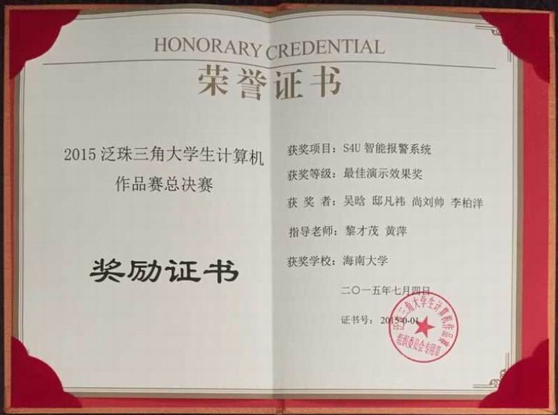 “泛珠三角大学生计算机作品赛”起源于2005年由广东省计算机学会、香港互联网协会和澳门电脑学会共同举办的“粤港澳(安利杯)大学生计算机作品赛”。2006年在广州举办了首届“泛珠三角大学生计算机作品赛”,目前已发展到泛珠三角区域的10个省、市、区以及港、澳、台地区的13个赛区。我院每年都派代表队参赛,在2011年曾取得金奖和最佳创新奖的最好成绩。 “S4U智能报警系统”简介:虽然国内在防盗报警方面一直有新的产品层出不穷,但始终没有从根本上或者很大程度上改善解决在防盗报警上的问题。一系列车辆被盗,入室盗窃案件依旧时常发生。目前市面上的防盗报警装置形式多样化却不全面,技术独特性高,却不普及与综合。且绝大多数是基于对防患于未然的监控与定位,并不能实现对于一系列的被盗窃产品的控制。基于此,团队计划开发一款以防盗报警和智能控制为主的智能报警系统,以软件端控制硬件端,彻底颠覆传统的从硬件到硬件的控制,彻底形成了由手机软件对于车载报警系统的硬件控制系统,而使防盗报警的智能锁市场进入一个全新的商业模式。在内容上,项目主要划分为防盗报警、智能控制和贴心服务三个项目。在技术上,产品主要依托于以AVR的型号Atmega16l的单片机和GSM模块是华为的gtm900a的硬件支持和TCP协议,结合现在已经成熟的GPS定位技术,GSM通讯技术,Bluetooth蓝牙传输技术等技术模块,配合软件编程上的安卓开发技术,共同组合了这项以软件产品控制硬件操作的智能报警系统。