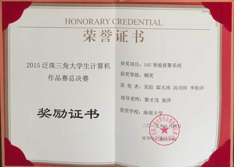 7月3日—4日,第10届“泛珠三角大学生计算机作品赛”总决赛在澳门举行。该竞赛由泛珠三角大学生计算机作品赛组委会主办,澳门电脑学会、澳门理工学院承办,我院学生研发的“S4U智能报警系统”团队代表海南参赛。本次总决赛共有来自40余所高等院校的52个作品200余名大学生参赛。经过两天的激烈角逐,我院的“S4U智能报警系统”团队脱颖而出,荣获最佳演示效果奖和铜奖。这是我省选手参加该项赛事历史上首次获得最佳演示效果奖。该团队成员来自2013级计算机科学与技术专业吴晗、邸凡祎、尚刘帅、李柏洋四位同学,指导老师是计算机系的黎才茂、黄萍老师。