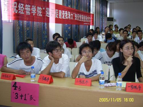 11月5日下午3:00经济管理学院“迎评促建爱我海大”知识竞赛分别在2—108和2-207教室隆重举行。比赛分为大一组和大二组,各有工商管理、国际贸、金融和会计四个专业的代表队参赛。前来观看比赛的有张井富、王华伟老师。