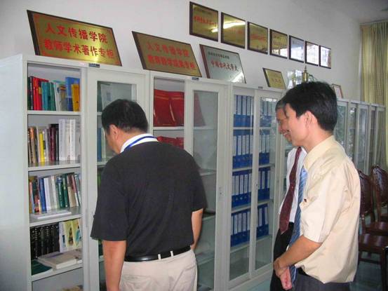 2005年11月14日下午4时,此次评估专家组组长,浙江工业大学党委委员、副校长,博士生导师肖瑞峰教授在我校工作人员的陪同下莅临我院视察,并与我院部分教师进行长达一小时的座谈。 座谈会上,肖教授听取了孙绍先院长对学院基本情况的汇报,随后针对汇报材料提出了一些问题,并着重强调人文学科在综合性大学专业设置中的重要地位和应着力发展的必要性。他指出,在综合性大学专业的设置上,要有所为有所不为,而人文学科必定是要有所为的。肖教授高屋建瓴的观点使在场的我院领导和教师均深有感触。 会议结束后,在院领导的陪同下,肖教授视察了我院评建办公室、学院二级图书馆及影视与传播综合实验室。