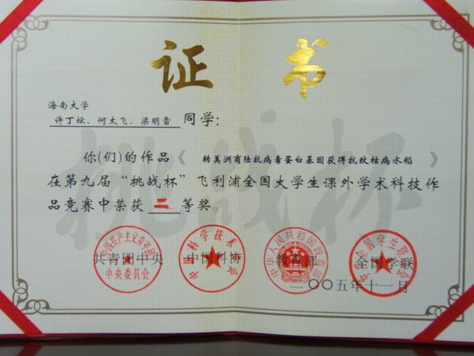 2005年11月17日,由共青团中央、中国科协、教育部、全国学联和上海市人民政府联合主办,复旦大学承办的中国大学生学术科技“奥林匹克”——第九届“挑战杯”全国大学生课外学术科技作品竞赛终审决赛在上海开幕。由我院罗越华副教授、史学群老师指导、2001级农学专业许丁坛、何太飞、梁明雷同学的科研作品《转美洲商陆抗病毒蛋白基因获得抗纹枯病水稻》荣获二等奖。