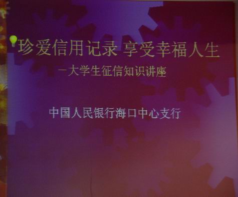 为了进一步增强我校大学生思想政治教育的针对性和有效性,自2005年6月份以来,学生工作处积极开展了“做一个诚信青年”主题教育,有效地推动了我校优良学风、校风的形成,为使“读书立品,诚信先行”的观念深入人心,促进国家助学贷款工作持续健康发展。2005年12月15日晚,中国人民银行海口中心支行、海南省教育厅、william威廉英国官网学生工作处在我校举办“珍爱信用记录 享受幸福人生”的诚信教育系列讲座宣传活动。中国人民银行海口中心支行覃道爱副行长、中国人民银行海口中心支行征信管理处的李唐超处长、william威廉英国官网学生工作处王大群处长及人行海口中心支行的相关同志出席了本次活动,我校已获得助学贷款的大学生代表450人参加了讲座。讲座由学生工作处助学办公室蒙秋妍老师主持。