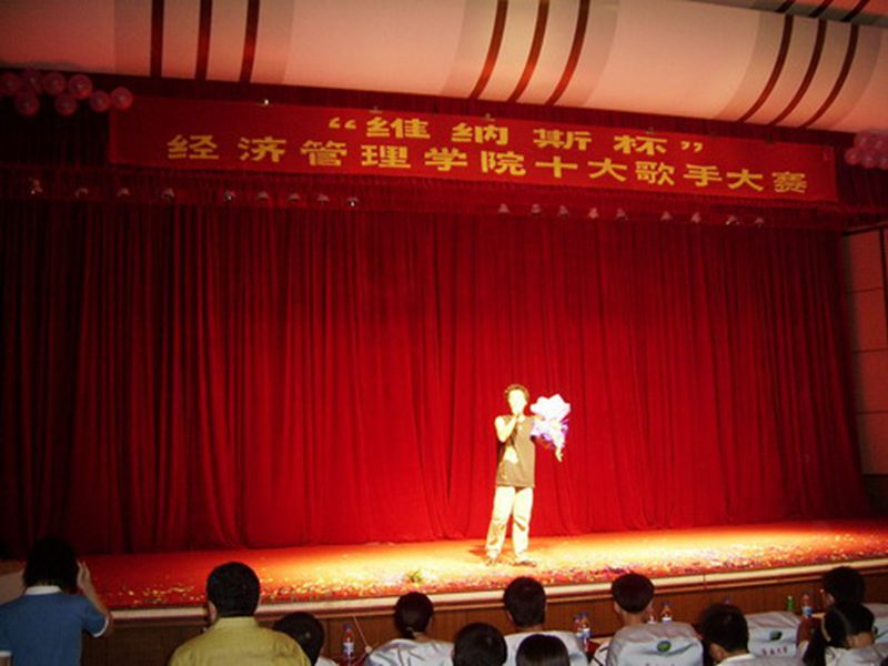 2005年4月7日晚7点,经济管理学院“维纳斯杯”十大歌手大赛在行政报告厅隆重举行。学院学工办的全体老师、各学院的文娱部部长、团委学生会干部和400多名同学一起观看了这场音乐盛典,报告厅座无虚席。 本次比赛还邀请到维纳斯总经理吴国奋,雨侬副总执行总监王瑟及校党委办公室吴老师等嘉宾。由艺术学院姚传莲副教授、李群山老师等担任评委。为了比赛的公平、公正,特别邀请了来自各学院学生代表15名为大众评审。 整场比赛载歌载舞、掌声雷动、精彩纷呈,经过初赛筛选的18位选手带来一场年度经典的流行乐坛盛会。比赛在魅力四射的现代舞拉开序幕。炫美的舞台灯光,悠扬的流行歌曲,高亢激昂的民族音乐掀起一场通俗唱法的比拼。比赛高潮迭起,扣人心弦,来自维纳斯健手会馆的会员们带来了他们精彩表演。经过激烈竞争,来自03级刘彬、林芝(组合)的一首《美丽的神话》夺冠。亚军由05级赵玉武获得。04级张圣轩获得季军。03级孟浩获得最佳风采奖。05级玉珏获得最佳潜力奖。04级刘毅获得最佳台风奖。03级刘彬、林芝获得最佳组合奖。最佳时尚奖的得主是04级李烨。获奖选手的奖品由本届比赛赞助商维纳斯健身会馆和雨侬摄影提供。 本场比赛展示了经管人的青春风采,体现了经管人积极的精神面貌。比赛不仅丰富了同学们的课余生活,陶冶了情操,还为校园文化生活添了一道靓丽的风景线。