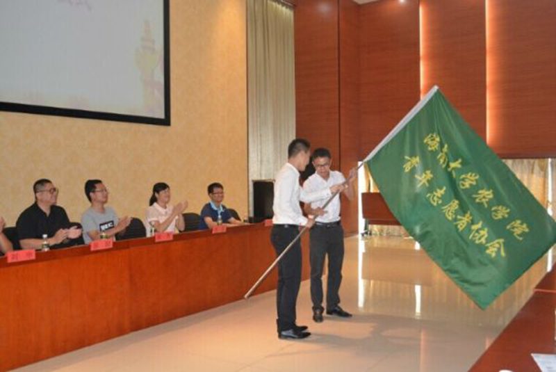 最后由校青协会长王曦向院青协会长曾朋授旗,与会嘉宾与院新一届青协理事会成员合影留念。