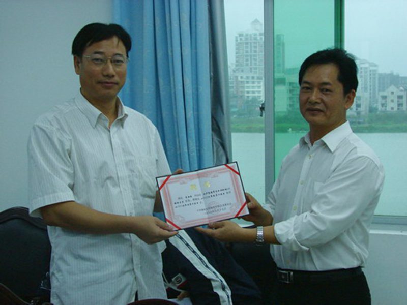副院长赖秋明副教授(右)为2005级水产养殖学(1)班班主任李洪武博士颁发聘书