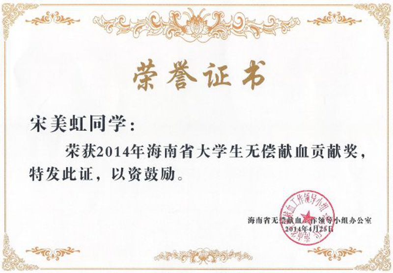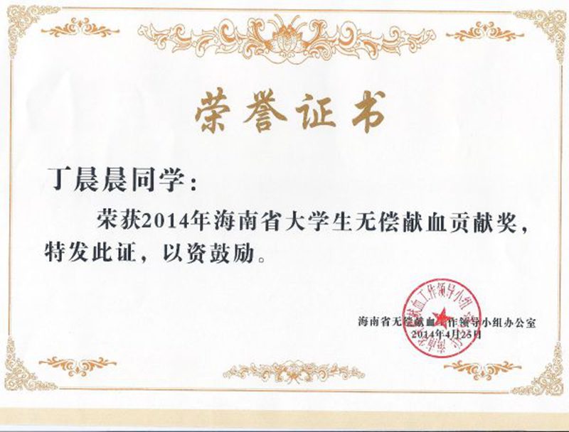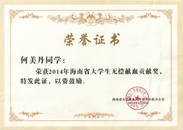 据悉,本次表彰是根据海南省无偿献血工作领导小组办公室《关于对高等院校无偿献血工作的表彰奖励办法》中的规定,对本科院校大学生在校期间献血4次以上(含4次)的同学予以表彰,旨在鼓励表彰高校学生在无偿献血这项利国利民的社会公益活动中的无私奉献行为。