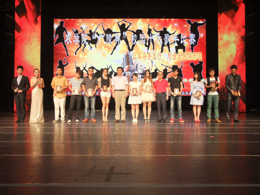 5月21日晚7点40,思源大礼堂掌声雷动,农学院“广陵杯”校园十大歌手决赛正在此火热进行中,此次比赛经过初赛和复赛层层选拔,共有十八位选手进入决赛。比赛邀请了彭发万老师、陈秀莲老师、陈阳老师、王瑚同学和吴柳静同学担任评委。农学院何朝族院长、黄承和书记、陈银华副院长、邱志春副书记以及海南广陵高科实业有限公司范庆君总经理观看了比赛。