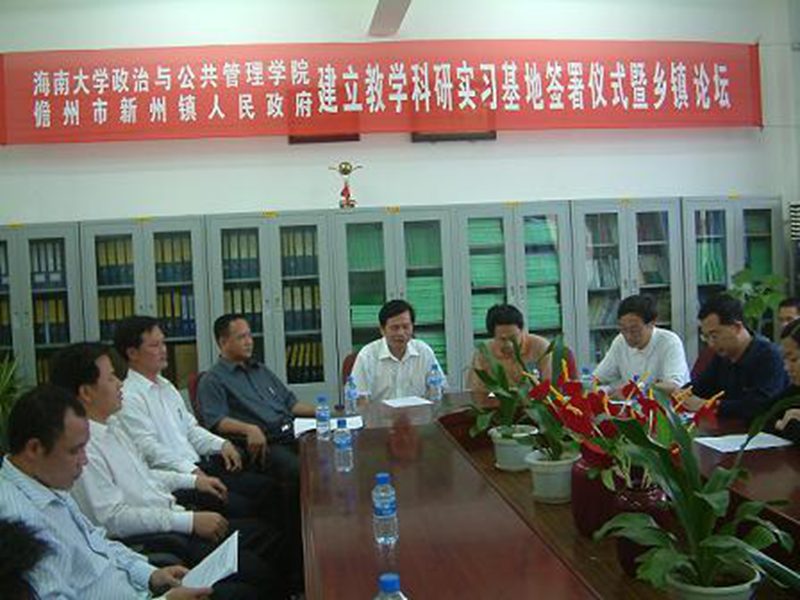 2007年3月23日下午2:40,学院会议室座无虚席,掌声阵阵。我院同儋州市新州镇人民政府建立教学科研实习基地签署仪式暨乡镇论坛隆重召开。新州镇委镇政府全体领导班子成员及各委办公室负责人、我院党总支王默忠书记、张治库院长、李德芳副院长、团委邢红斌书记以及全体学生干部出席了会议。会议分两部分: