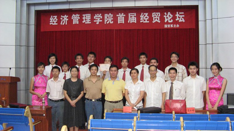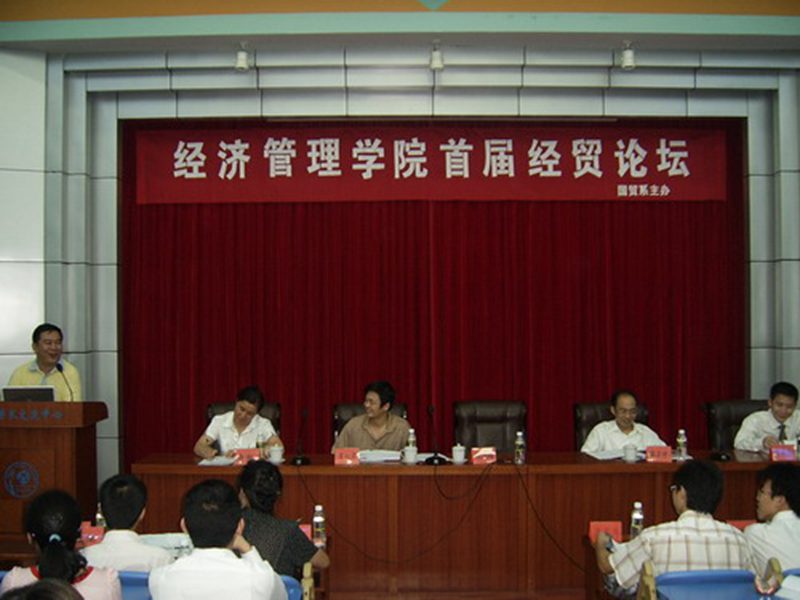 2007年3月31日晚7:30由国贸系团总支主办的“经济管理学院首届经贸论坛”在邵逸夫学术交流中心隆重举行。出席本次论坛的有商务厅政治法规处姬国辉处长,副院长李仁君教授,张尔升教授,郭凯董事长,李灵泉经理,国贸系主任王宏老师,院团总支书记谭继,谢辉凡老师,学生会主席蒋永明,未来经理人俱乐部创始人黎贵林及各班团支书代表和广大学生,场内座无虚席。