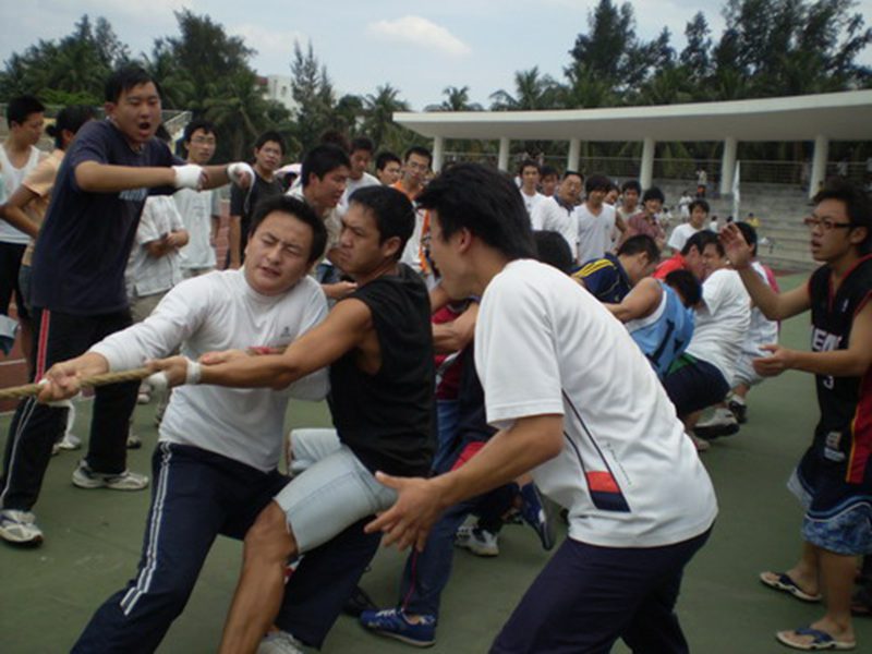 消息传来,男队队员也兴奋不已,他们用坚定的眼神告诉我们,男队也能行。经管队和法学队面对面站在了中线的两边,紧握手中的麻绳,随着一声哨响,队员们“一,二,三。。。”的口号铿锵有力,啦啦队的呼声也震耳欲聋。比赛异常激烈,经管队员以“力拔山兮气概世”的气概一鼓作气赢得了比赛,取得了冠军。男女双双夺冠!这一完美的结果使得每一个经管人都无比振奋,尽情抒发心中的畅快。比赛结束了,男女队的队员以及学工办的各位辅导员合影留念,每一个人脸上的笑容都被定格成永恒。