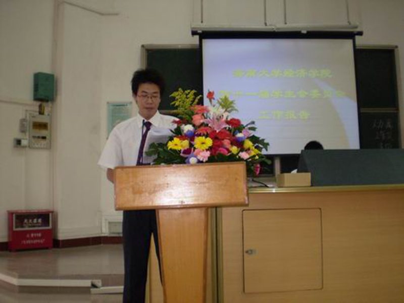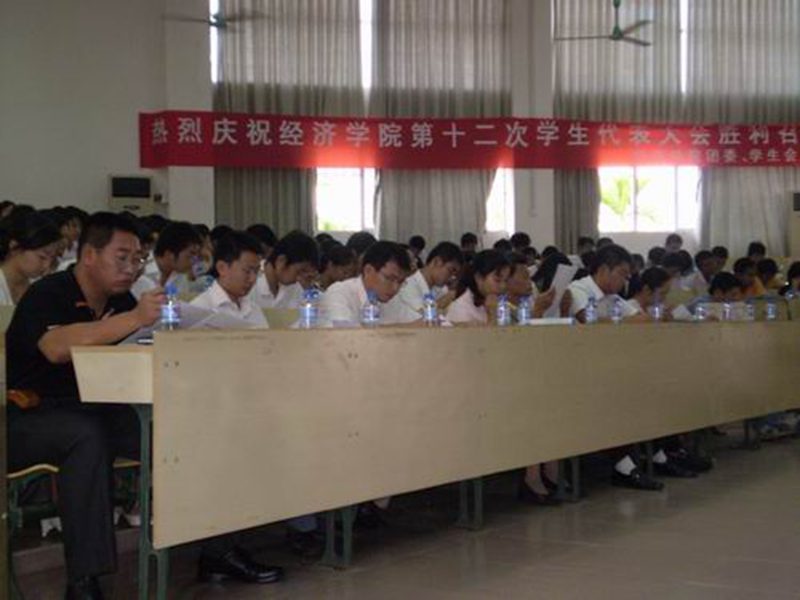 2007年10月21日下午2:30分,经济学院第十二次学生代表大会在2-108如期举行。本次大会由我院学生会,团委筹备,举办。并得到了校团委、学院领导、校级及各院级兄弟学生会的支持与关注。院党总支书记符史岱、副书记冯广波、学工办吴新主任、院团委谭继书记、黄乐老师、谢辉凡老师、张乃脆老师以及校学生会和各兄弟学院学生会代表出席本次会议。此次大会按规定选举的代表共218名,其中女生代表106名,少数民族代表5名。全场座无虚席。