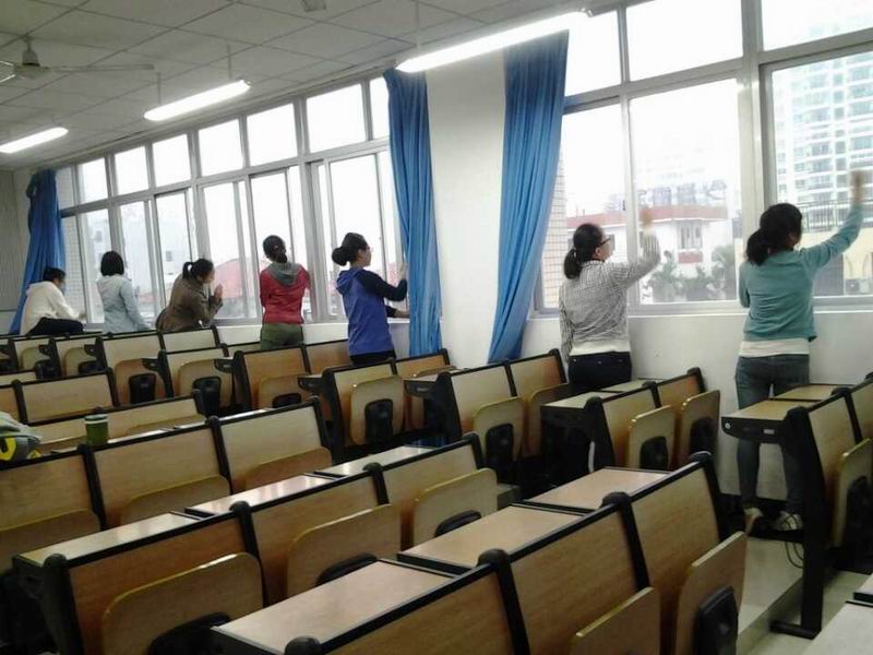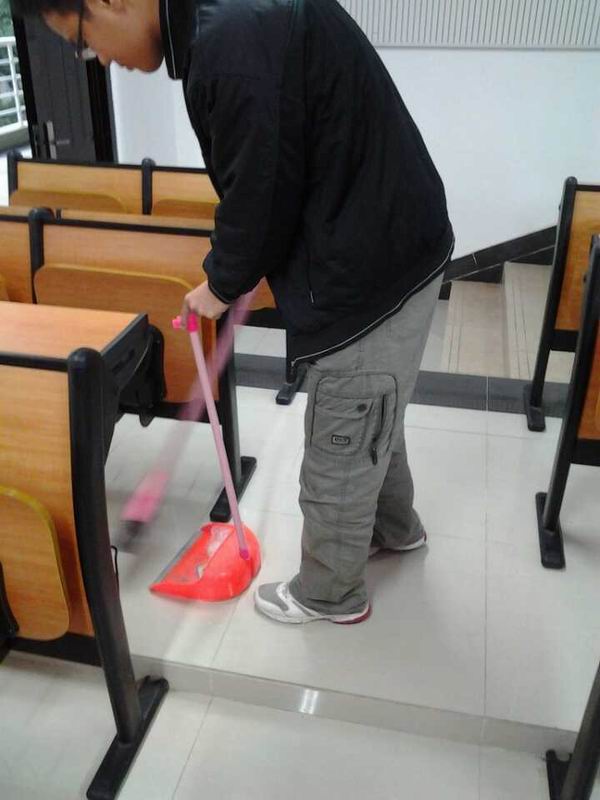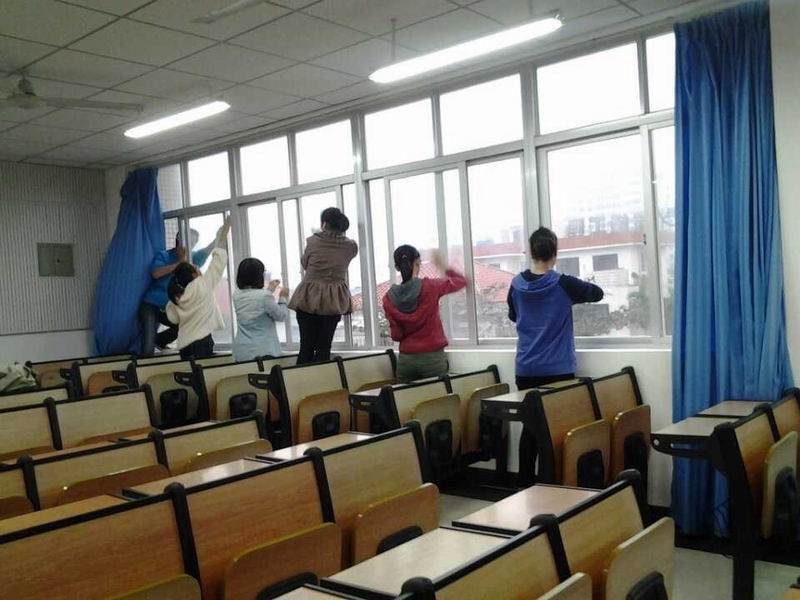 为了给同学们营造干净卫生的学习环境,2013级数学与应用数学专业同学们开展了“创文明学习环境”为主题的教室清洁活动。5教302教室是同学们经常上《数学分析》课的地点。 2013年12月12日上午,同学们在课后对教室进行了清洁。 同学们带着买来的拖把,扫帚,簸箕及抹布,一下课就如火如荼地干了起来。同学们分成若干小队,女生们主要负责擦窗、擦门、整理讲台;男生们负责擦黑板、整理黑板槽、擦讲台、扫地、拖地。活动中,同学们耐心、细致地打扫教室卫生,不放过任何一个死角。大家一会儿去到洗手间涮拖把,一会儿去洗抹布,忙的不亦乐乎。虽然很脏很累,但看到焕然一新的教室,大家都脸上露出灿烂的笑容。看着窗明几净的教室,感觉在这样的环境中学习效率会更高和心情会更好! 这次的打扫卫生活动,不仅帮我们日常学习的环境“换了新装”,也让大家体会了劳动的愉快。打扫的同时,同学们也发现教室里遗留了许多垃圾,这也是开展本次活动的原因之一。希望借次活动呼吁同学们要自我约束,培养“清洁由我做起”的良好意识。