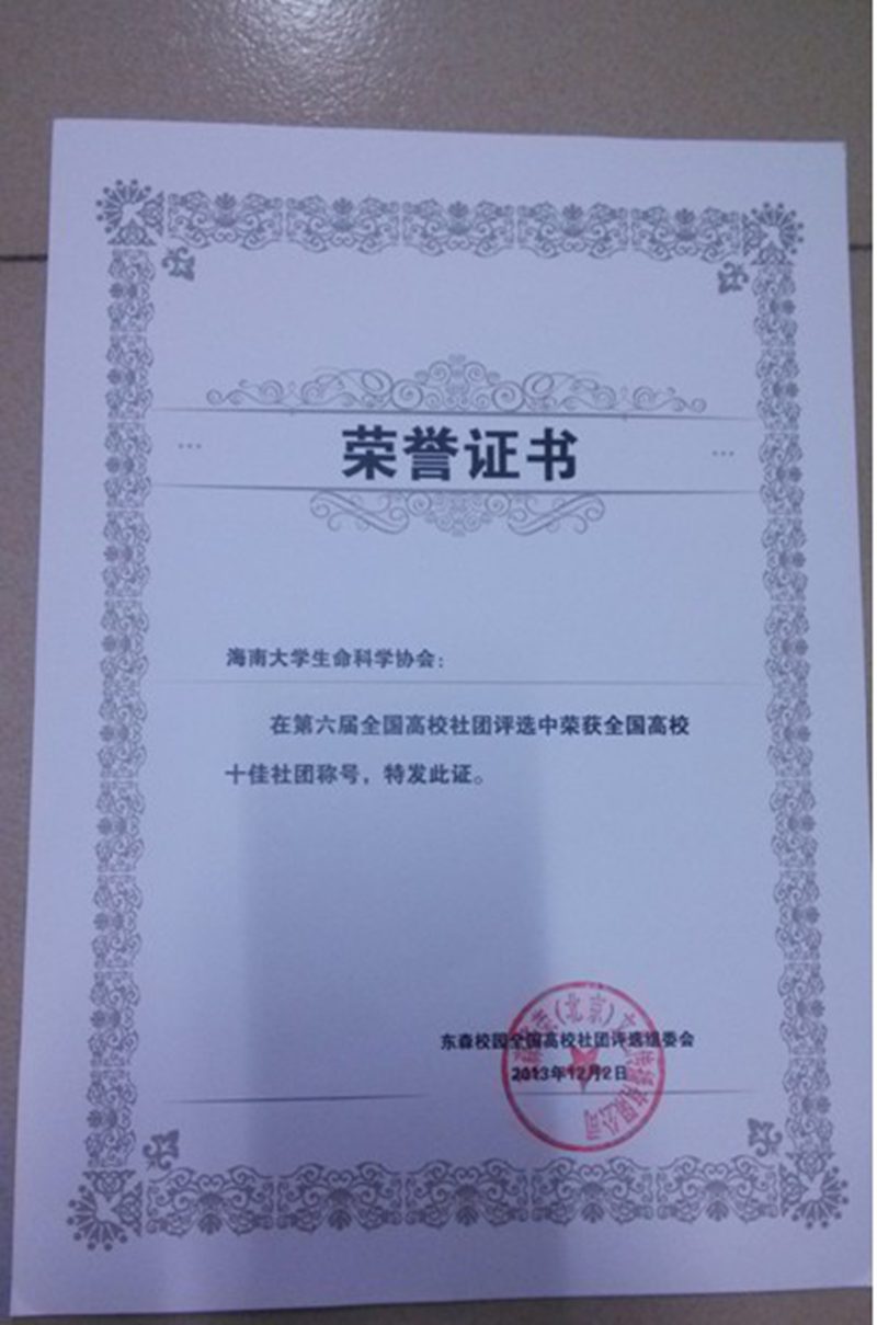 2013年12月2日,第六届全国高校社团评选结果揭晓,william威廉英国官网生命科学协会荣获“全国高校十佳社团”称号,获奖证书于2014年1月3日寄到。这是我社自2012年成立以来首次在全国高校社团评选中取得如此佳绩,是我校在学生社团建设中取得的丰硕成果。
