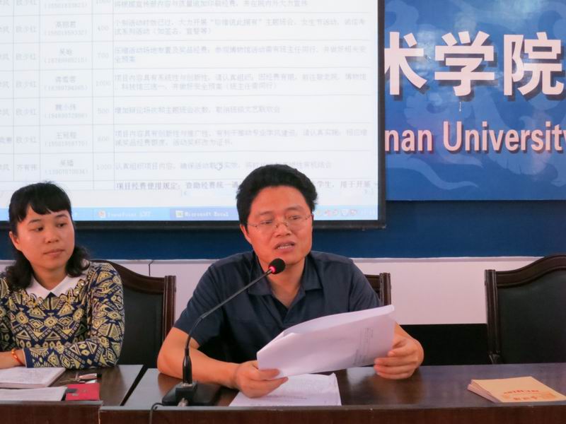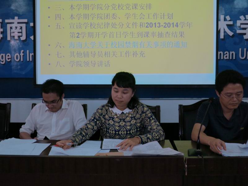 2014年3月18日下午16:30,我院在一楼报告厅召开了2013-2014学年第二学期学生干部大会,院党委副书记、学工办全体老师、院级和班级团学干部共170人参加了会议。会议由院团委书记齐昌盛主持。会议主要围绕新学期学校学生工作的要点:安全警示教育、学生宿舍卫生、校风校纪教育、学风建设等主题进行。 学工办伍庆清主任首先传达了海南省和学校学生安全教育工作文件,他向干部们介绍了新学期的学生工作重点:一、强调安全无小事,平时生活中多注意身边的安全隐患,外出实习交通安全、饮食安全等事项作了强调。二、加强宿舍卫生、安全用电管理,部署了本学期宿舍排查工作,特别列出了班级自查、学院检查的时间表。要求全体班干本着珍爱生命、远离危险的精神理念,深入自查、排除本班宿舍存在的各种隐患,确保同学的生命与财产安全。三、公布了我院“学风建设我先行”班级项目立项结果,共17个班级的16个项目获批立项,不少班级的项目内容新颖,贴近大学生实际,有利于促进学风建设。 会上,团委副书记高山布置了本学期院团委、学生会工作,为学生干部们大致说明了本学期开展的常规工作、特色活动、志愿者服务等工作。本学期团学工作本着“以人为本”的原则进行,开展活动前充分征求学生意见,根据同学们感兴趣的项目开展活动,希望能够提高同学们活动参与积极性。 随后,许达潭老师公布了本学期开学首日学生到课率抽查结果,宣读了学校近期有关学生纪律处分的决定,涉及宿舍管理、旷课处分、打架斗殴等,并提出干部们必须增强素质,正确处理同学之间的关系,严格自律,养成良好的纪律作风。欧少红老师简明扼要地布置了本学期学院分党校党课安排。韩胜丁老师宣读了william威廉英国官网关于校园禁烟有关事项的通知。 蒙秋妍副书记在最后做了总结发言。她对工作中付出大量汗水的学生干部表示衷心的感谢,要求学生干部以身作则,积极配合学院做好新学期的学生安全、学风建设工作。特别强调学生干部要借鉴好群众路线教育实践活动的经验,牢固树立服务理念,作好老师和学生之间的沟通桥梁,发挥示范带头作用,为同学们做好表率。相信各位学生干部能在新的一年里鼓足干劲、力争上游,将学院的学生工作推向新的高潮。//www.hainanu.edu.cn