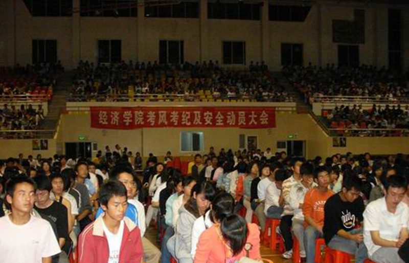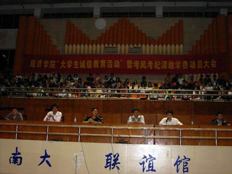 12月22日晚8点30分,经济学大学生诚信教育活动暨考风考纪、清缴学费动员大会在联谊馆举行,出席此次会议的老师有学院党委符史岱书记、冯广波副书记,学工办吴新主任、团委书记谭继主任以及全体辅导员和全院学生。