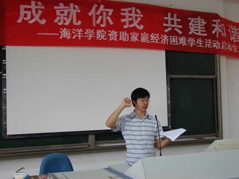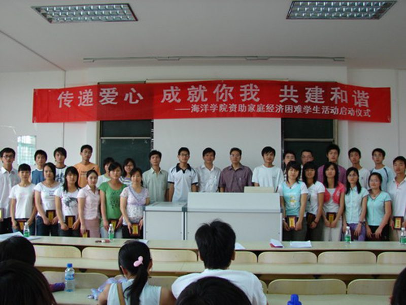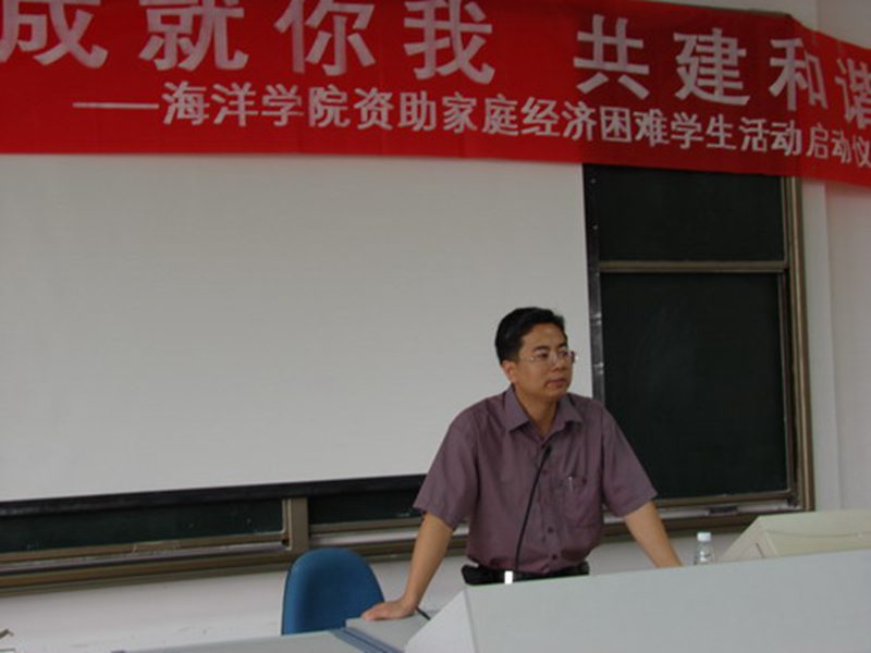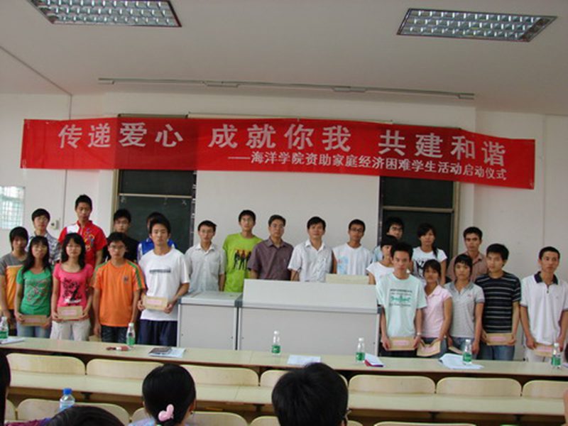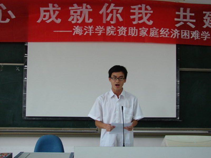 之后,捐助人代表2005级制药工程专业黄伟同学和受助人代表2006级制药工程专业黎明同学分别发表感言,激励同学们在无法选择家庭条件的情况下,一定要用自立、自尊、自信、自强的精神克服困难,克服贫困,同时表示一定要努力学习,刻苦钻研,用行动回报社会,将爱心之火继续传递,争做今天受助,明天自助,后天助人的优秀学子。黎明同学还向全体贫困生发出共同宣誓的倡议,将整个仪式推向了高潮。 最后,陈平书记做了启动仪式的总结讲话。陈平书记一再地对同学们说“贫困并不可怕,可怕的是没有自信”,激励同学们要勇于拼搏,发奋图强,自强不息,诚实守信,学会感恩,回报社会,并以高尚的人格魅力感染身边的每一个人;同时他感谢同学们对学院帮困助学工作的支持,希望同学们能为树立帮困助学良好风尚、弘扬团结互助传统美德、营造融洽和谐社会氛围继续努力。 海洋学院资助家庭经济困难学生活动已由单面浅层的经济帮助走向精神与心灵的再造,资助贫困大学生活动是爱的流淌,也是力的锻造。