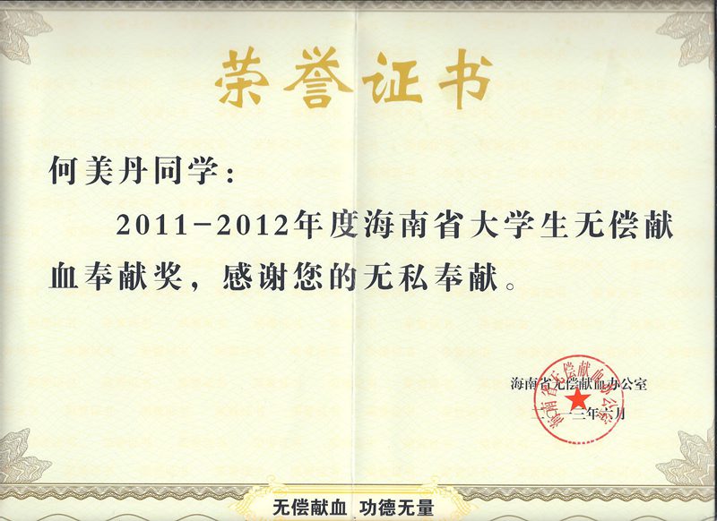 何美丹等3名同学用他们的热血为我们树立了榜样,他们的美德及感人事迹将鼓励和倡导全院师生传承中华民族博爱互助的光荣传统,凝聚爱心力量,传播文明风尚,为确保海南省采供血和临床用血安全,推进海南无偿献血事业持续健康发展作出自己的贡献。