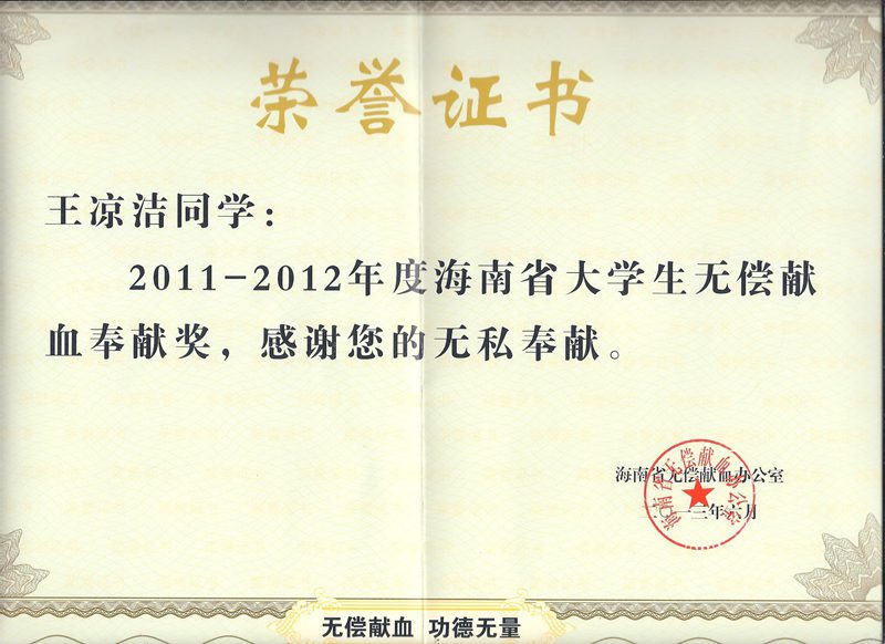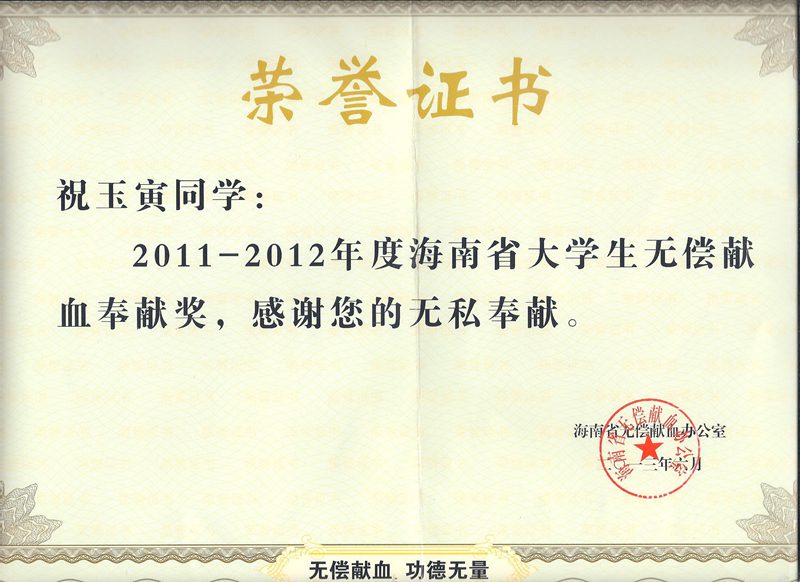 6月13日晚,由海南省委宣传部、海南省卫生厅、海南省文化广电出版体育厅、海口市人民政府、海南省文联等五部门联合主办的“海南省无偿献血英雄表彰大会暨主题文艺晚会”在海口市人大会堂隆重举行,农学院2012级博士研究生何美丹,2011级硕士研究生王凉洁,2010级农业资源与环境本科生祝玉寅3位同学荣获“海南省大学生无偿献血奉献奖”。