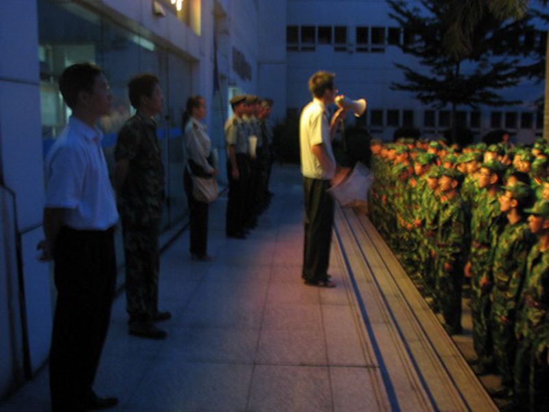 根据学校的统一部署,信息科学技术学院2008级新生军训工作于9月7日全面启动。 当日下午6:30,三中队(即信息学院)新生军训工作启动仪式在信息学院大门前隆重举行。来自部队某旅的刘元春中队长以及林臣相、姜红权、张广慧、商泽勇、刘开志、徐月伟、张海灵等七名分队长,我院学工办主任、中队指导员伍庆清、副指导员靳婷、副中队长许达潭(注:2008级政治辅导员)全部到位,院党委副书记曲涛和院团委书记欧少红出席。